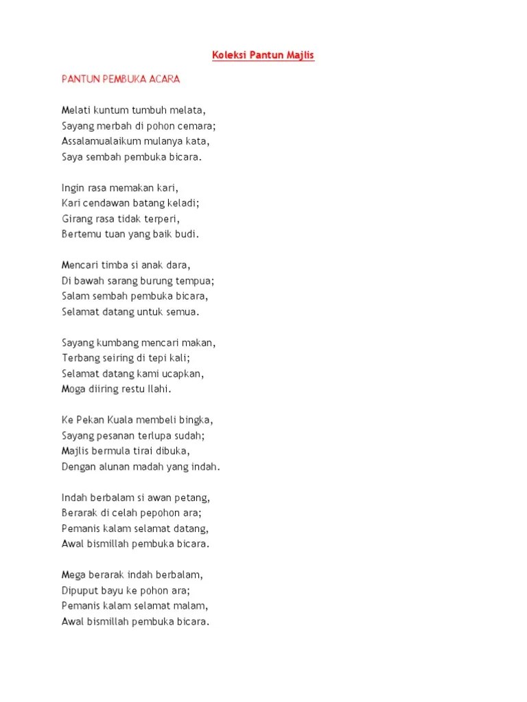 Panduan mc pelepasan pegawai purna bhakti dan buka puasa bersama. Pantun pembukaan acara juga sebaiknya disajikan oleh seorang mc,. Berikut ini kumpulan dan contoh pantun penutup pidato tentang presentasi, dakwah, ceramah terbaru untuk semua kalangan anak anak, remaja, . Pantun pembuka bicara dan penutup majlis pantun pembuka acara. Apabila kita dapat membuka sebuah pidato di depan orang banyak dengan menarik .